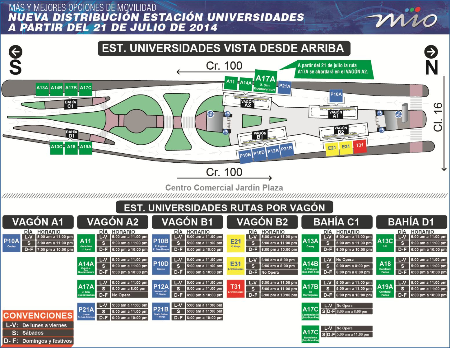 Por su parte la ruta A17A Universidades – UAO – U. San Martín, atenderá exclusivamente las paradas en las universidades Autónoma y San Martín, así como en el sector de Bochalema. Esta ruta ingresará a la plataforma alta en la estación Universidades, donde compartirá la parada con las rutas A11, A14A y P21A. Esta ruta operará de lunes a viernes en el periodo de 5:00 a.m. a 10:00 p.m. hasta la universidad San Martín; y entre las 10:00 p.m. y las 11:00 p.m., retornará en el crucero a Puerto Tejada. En ambos casos la ruta A17A quedará atendiendo el sector de Bochalema por la Calle 42 entre las carreras 114A y 109. Los sábados operará de 5:00 a.m. a 8:00 p.m. hasta la universidad San Martín y los domingos no funcionará porque quedará operando la ruta A17C.