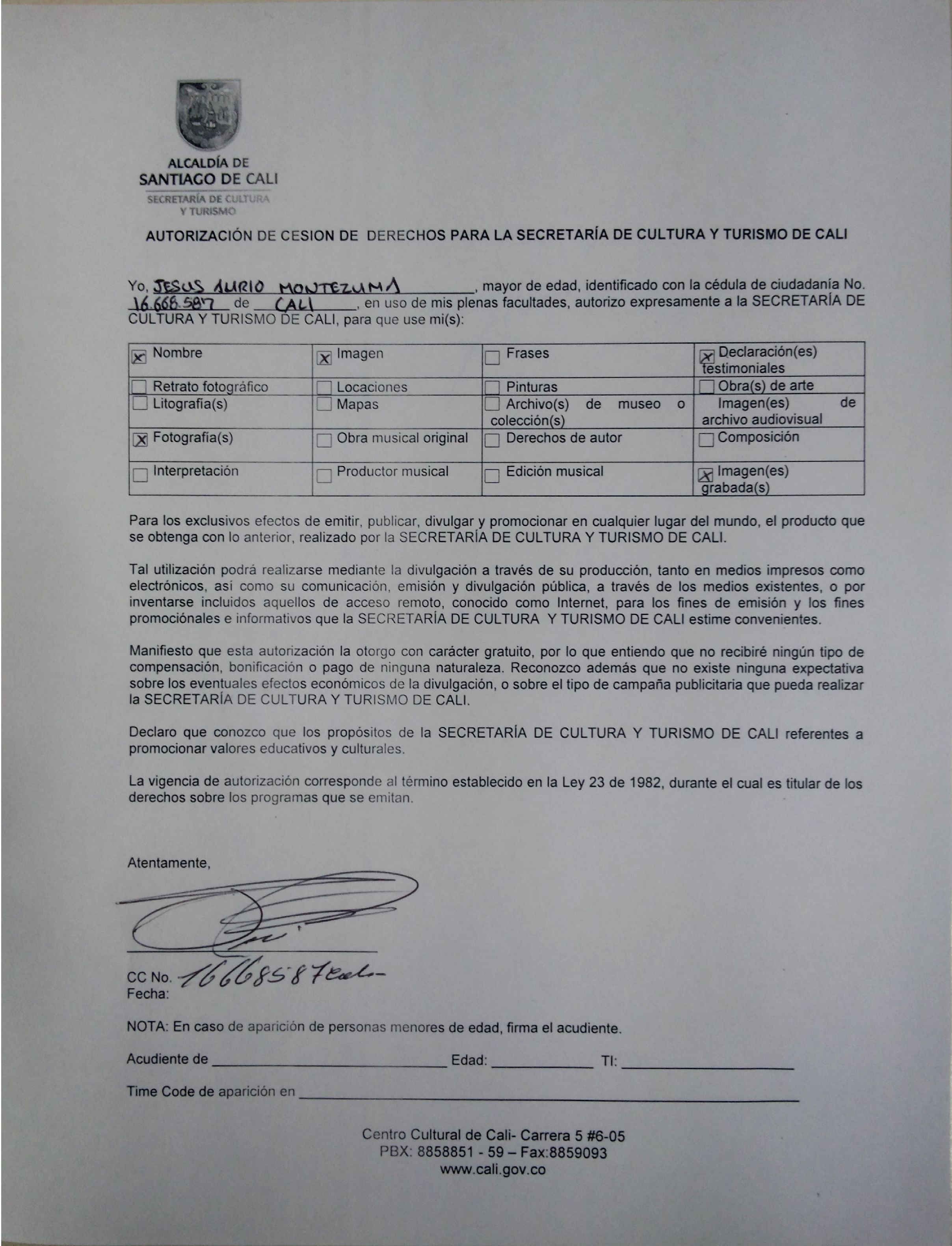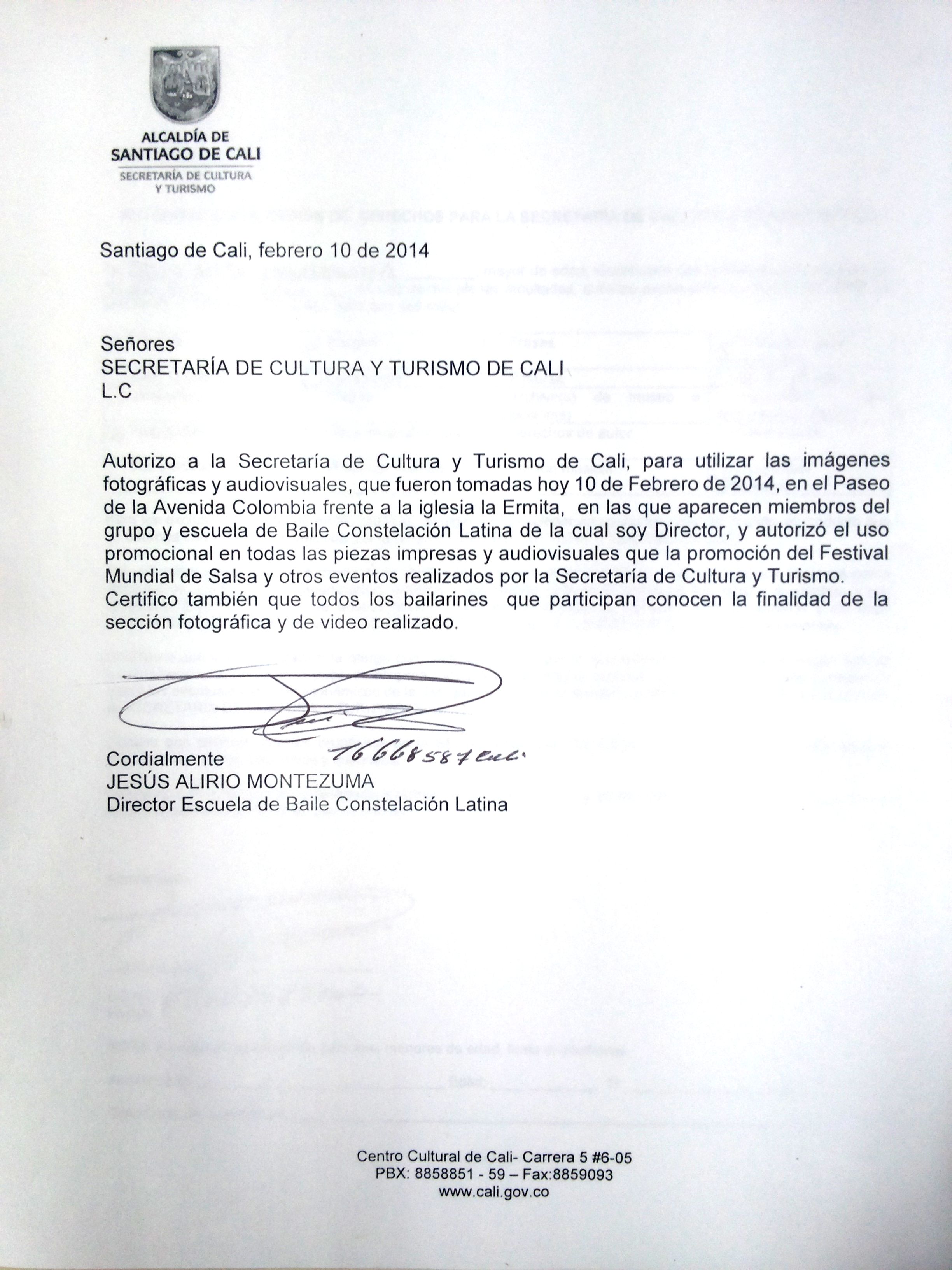 De esta autorización, la Secretaría de Cultura y Turismo de Cali, tiene un registro fílmico del propio bailarín, en el que opina sobre la importancia de  aparecer como imagen  del  IX Festival Mundial de Salsa  2014.