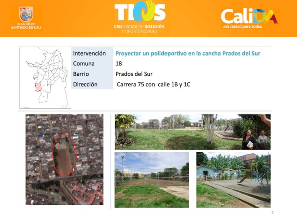 El mejoramiento locativo del polideportivo Las Orquídeas y el apoyo para la cooperativa de los jóvenes del mismo barrio; la recuperación ambiental y física del canal Figueroa y la adecuación del parque Gabriela Mistral, ambos en el barrio Alfonso Bonilla Aragón; sumado a la pavimentación de transitadas vías, forman parte del paquete priorizado por la estrategia TIOS.