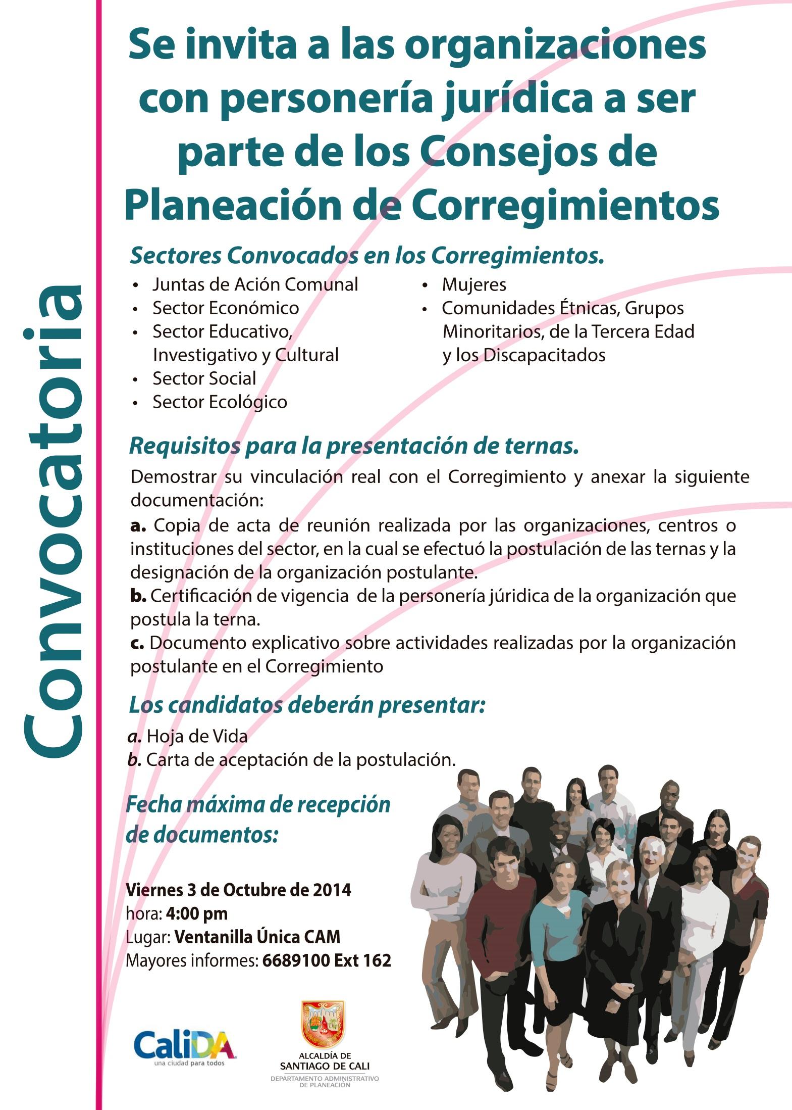 Para ser parte de los Consejos de Planeación de la comuna o el corregimiento, las organizaciones jurídicamente reconocidas de los sectores convocados deben presentar sus ternas, hasta el 3 de octubre de 2014 a las 4:00 p.m., mediante comunicación dirigida a Planeación Municipal, radicada en la Ventanilla Única del Centro Administrativo Municipal, CAM, piso 1.
