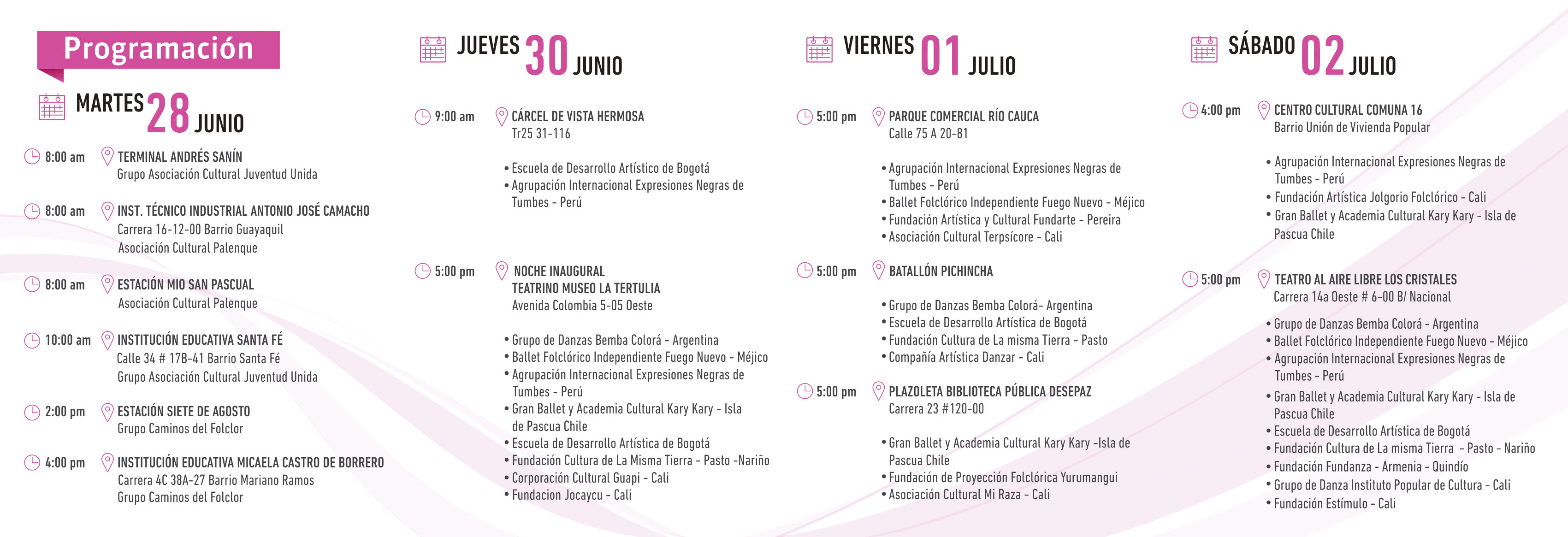 La Secretaría de Cultura y Turismo de Cali, siguiendo los lineamientos del Alcalde, Maurice Armitage, diseñó una completa y variada programación, que busca el mayor número de presentaciones populares, sin costo alguno, en distintas comunas y corregimientos de la municipalidad, desde el próximo martes 28 de junio.