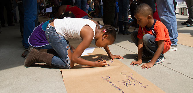 Más de 200 niños y jóvenes escribieron en murales mensajes alusivos a la paz y a la no violencia durante la jornada ‘Mambrú no va a la guerra, esto es otro cuento’, liderada por la Agencia Colombiana para la Reintegración con el apoyo de la Asesoría de Paz.