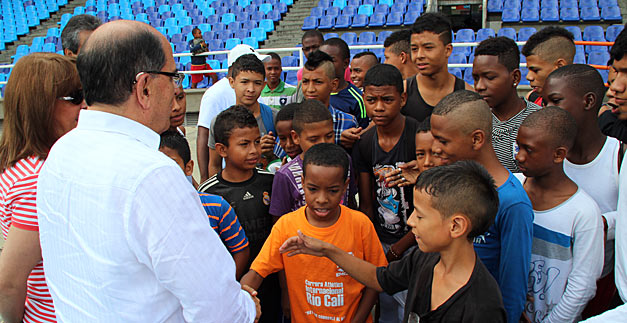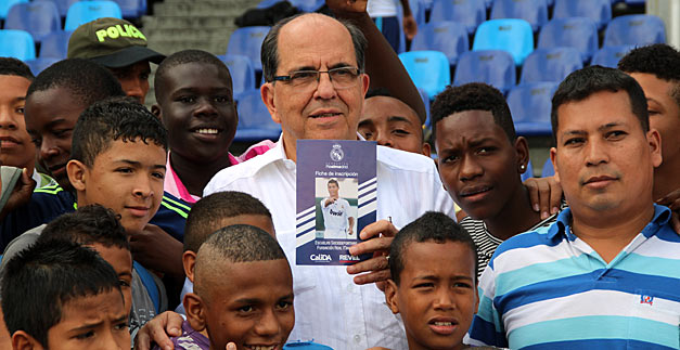 Con su rostro visiblemente emocionado, el alcalde de Santiago de Cali, Rodrigo Guerrero Velasco, supervisó los ciclos de entrenamiento realizados por varias decenas de niños inmersos en el programa Escuelas Sociodeportivas  que desarrolla la Administración caleña, la Fundación Revel y el Real Madrid, en esta capital.