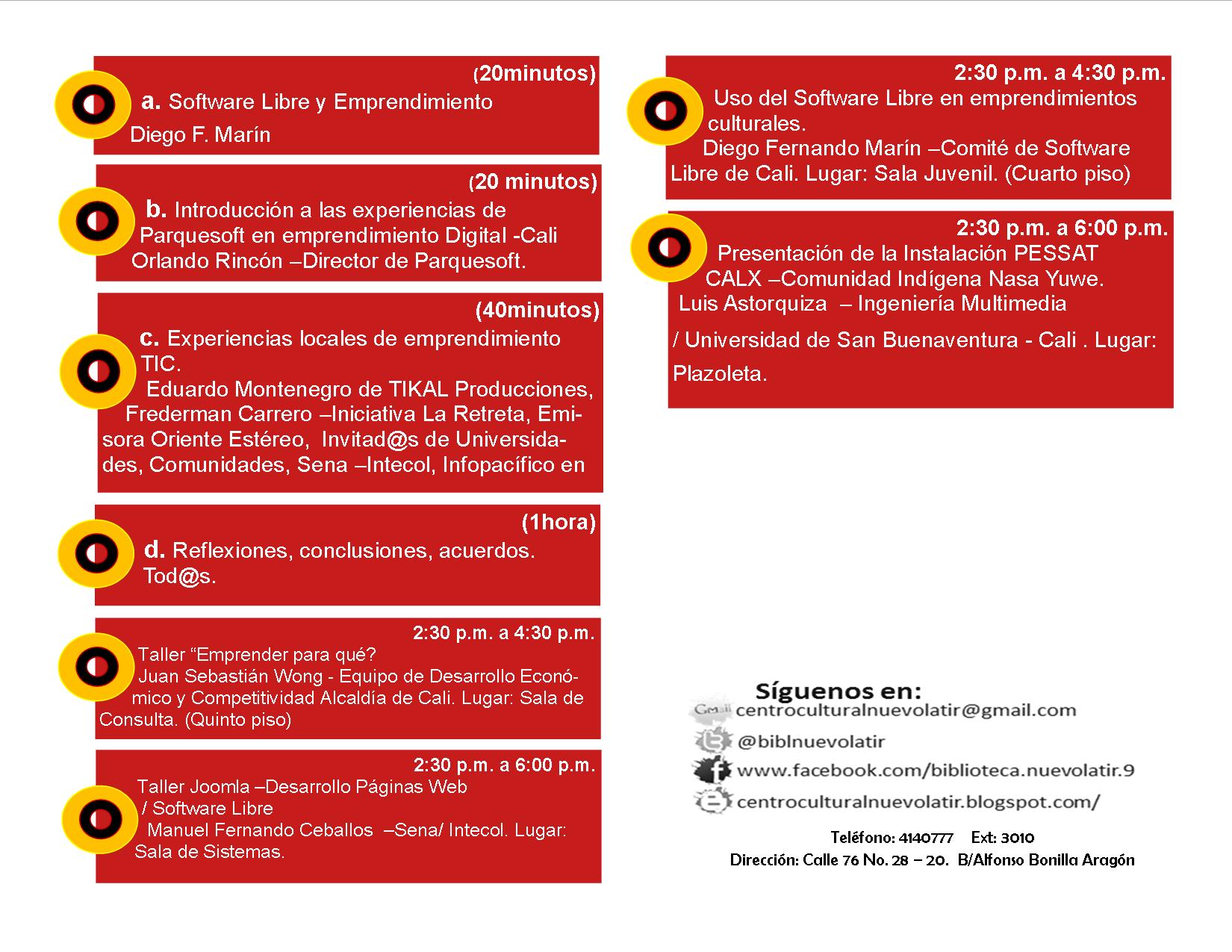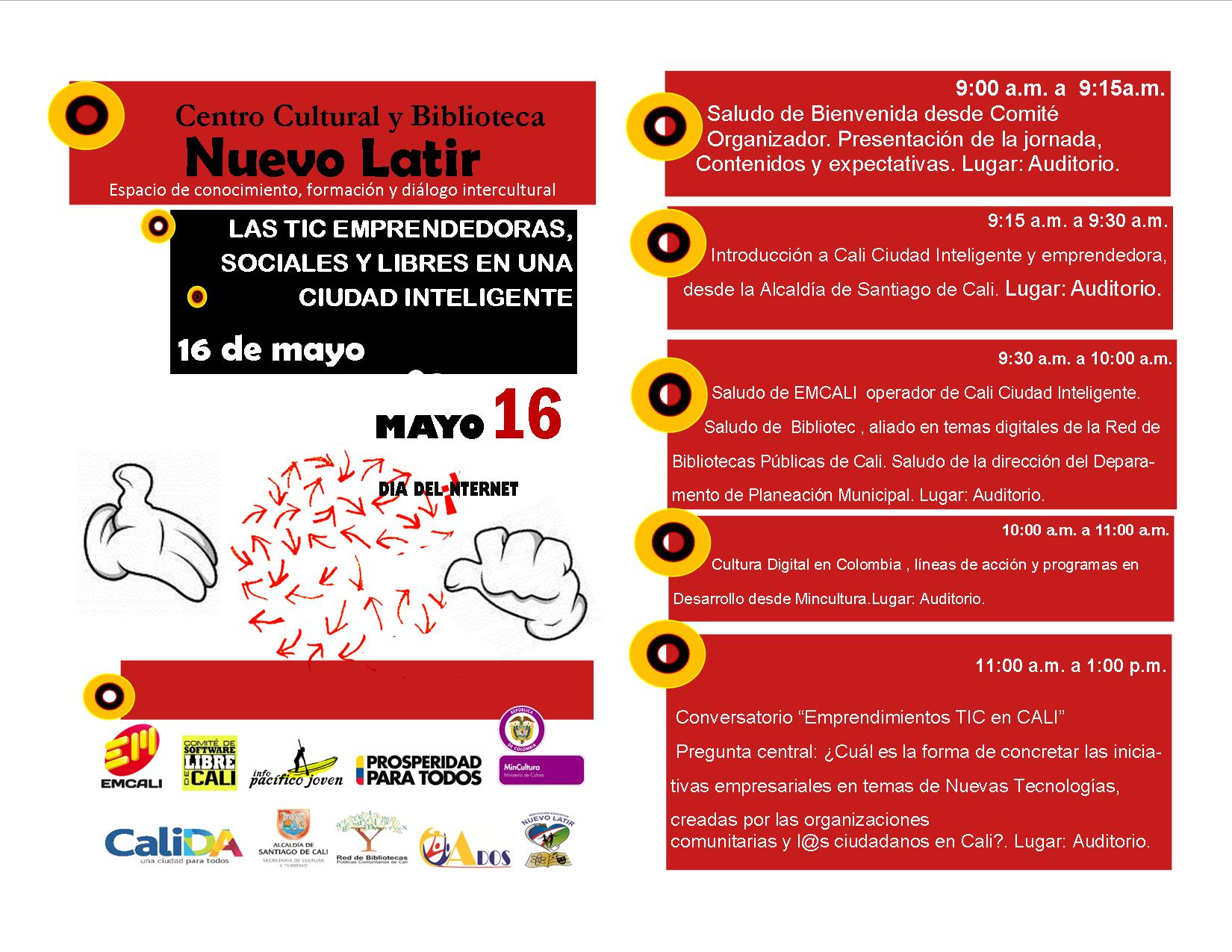En el caso de la Ciudadela del Nuevo Latir en la Comuna 14, se ha programado una completa programación desde las 08:00 de la mañana, que incluye temas como la ‘Cultura Digital en Colombia’, ‘Emprendimientos TIC´s en Cali’, ‘Experiencias Exitosas’, ‘Usos del software libre’ y otros enfoques, que se dictarán de manera abierta para la ciudadanía.