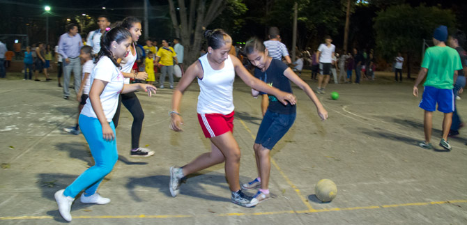 Jóvenes y niños de la comuna 9 destacan que gracias a la luz blanca en sus parques y zonas verdes han podido volver a practicar fútbol con más seguridad.