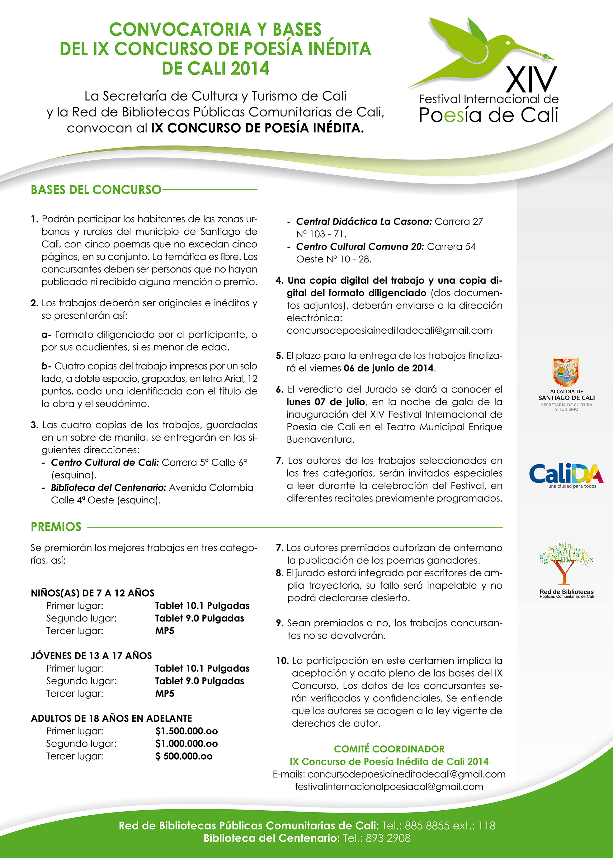 El propósito es facilitar la entrega de propuestas a los caleños que residen en diferentes puntos cardinales de la ciudad, para este concurso que se enmarca en la dinámica del XIV Festival Internacional de Poesía de Cali, a desarrollarse del lunes 07 al domingo 13 de julio de 2014.