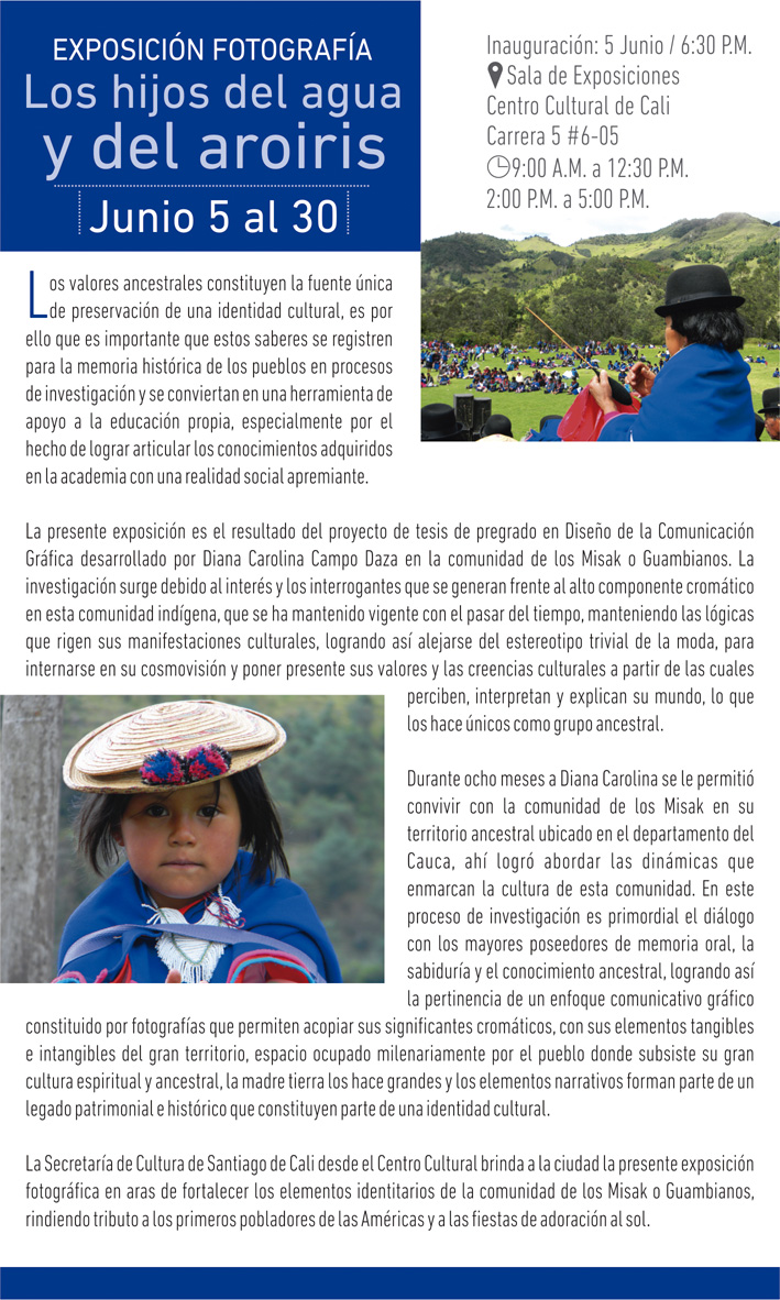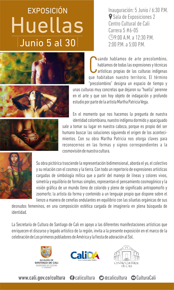 El 5 de junio de 2014 se inaugurarán las exposiciones ‘Huellas’ y ‘Los Hijos del Aro del Agua y del Aroiris’, a las 6:30 p.m., en las salas de exposición 1 y 2 del Centro Cultural de Cali.