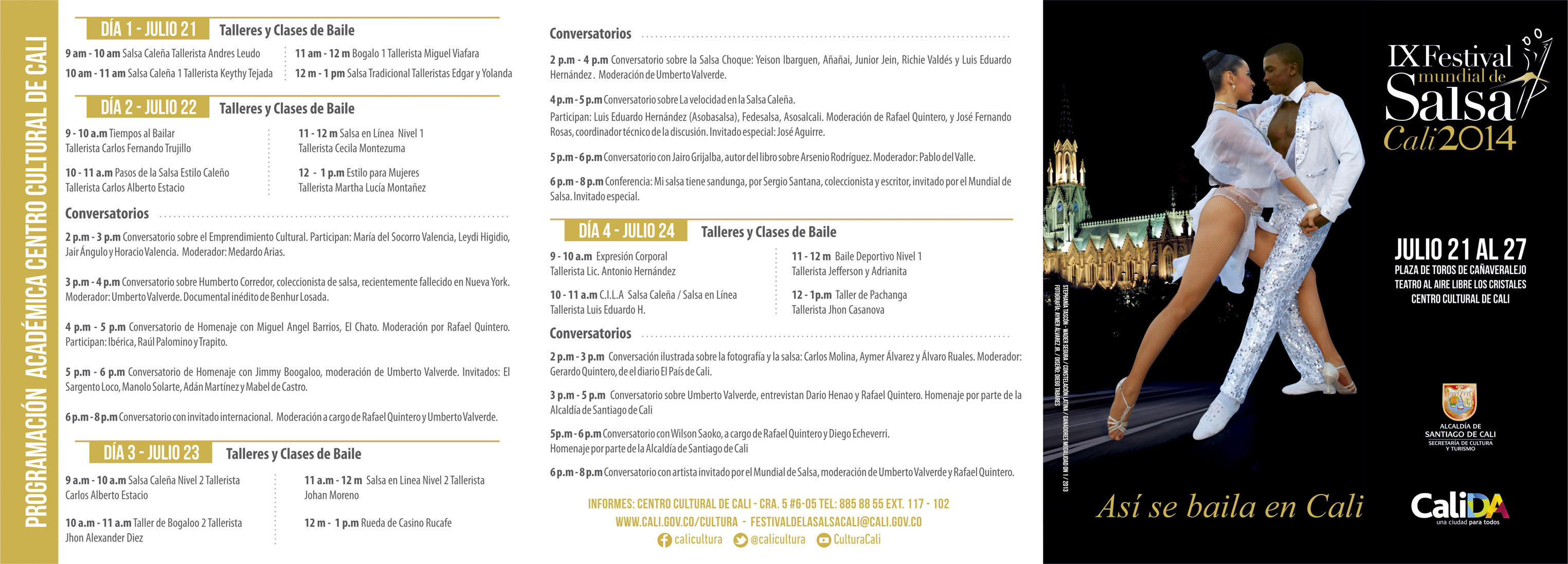 • 10:00 – 11:00 a.m.: Pasos de la Salsa Estilo Caleño. Tallerista Carlos Alberto Estacio.