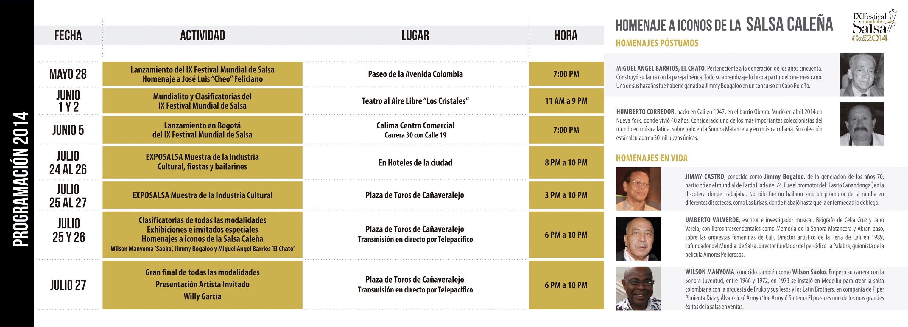 • Julio 25 y 26 – de 6:00 pm a 10:00 p.m.: Semifinales en todas las modalidades. Exhibiciones e invitados especiales. Homenajes a iconos de la Salsa Caleña. Lugar Plaza de Toros de Cañaveralejo. Transmisión en directo por Telepacífico.