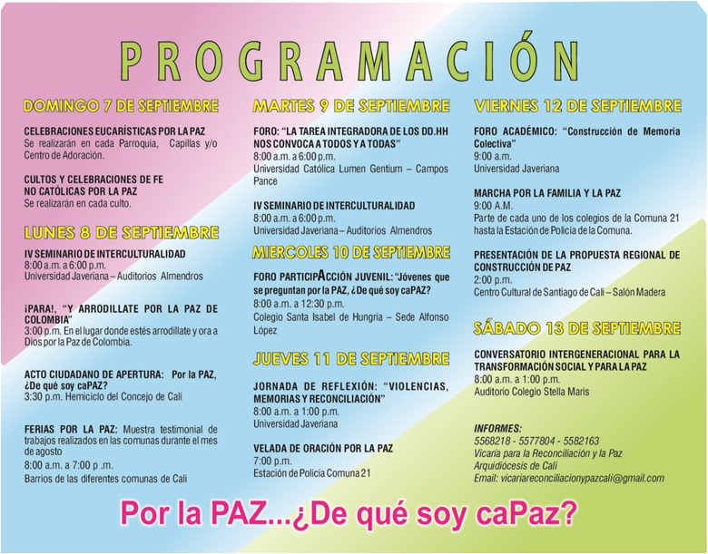 Dentro de las actividades más representativas de la programación se encuentra las celebraciones eucarísticas y cultos cristianos por la paz; IV Seminario de Interculturalidad; “¡Para!, y arrodíllate por la paz de Colombia”; Foro ParticipACCIÓn Juvenil; veladas de oración por la paz en la comuna 20, entre otros.