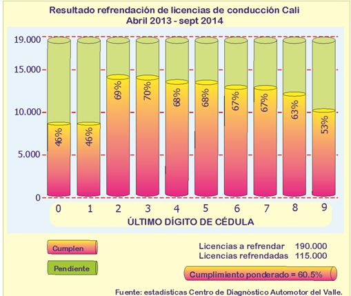 Según los cálculos realizados por el Centro de Diagnóstico Automotor del Valle, con un margen de error del 5%, la medida del gobierno obligaba en Cali a 190.000 ciudadanos a refrendar su licencia y hasta la fecha 115.000 personas lo han hecho. El siguiente cuadro refleja el cumplimiento de la medida según el último dígito de cédula de los ciudadanos.