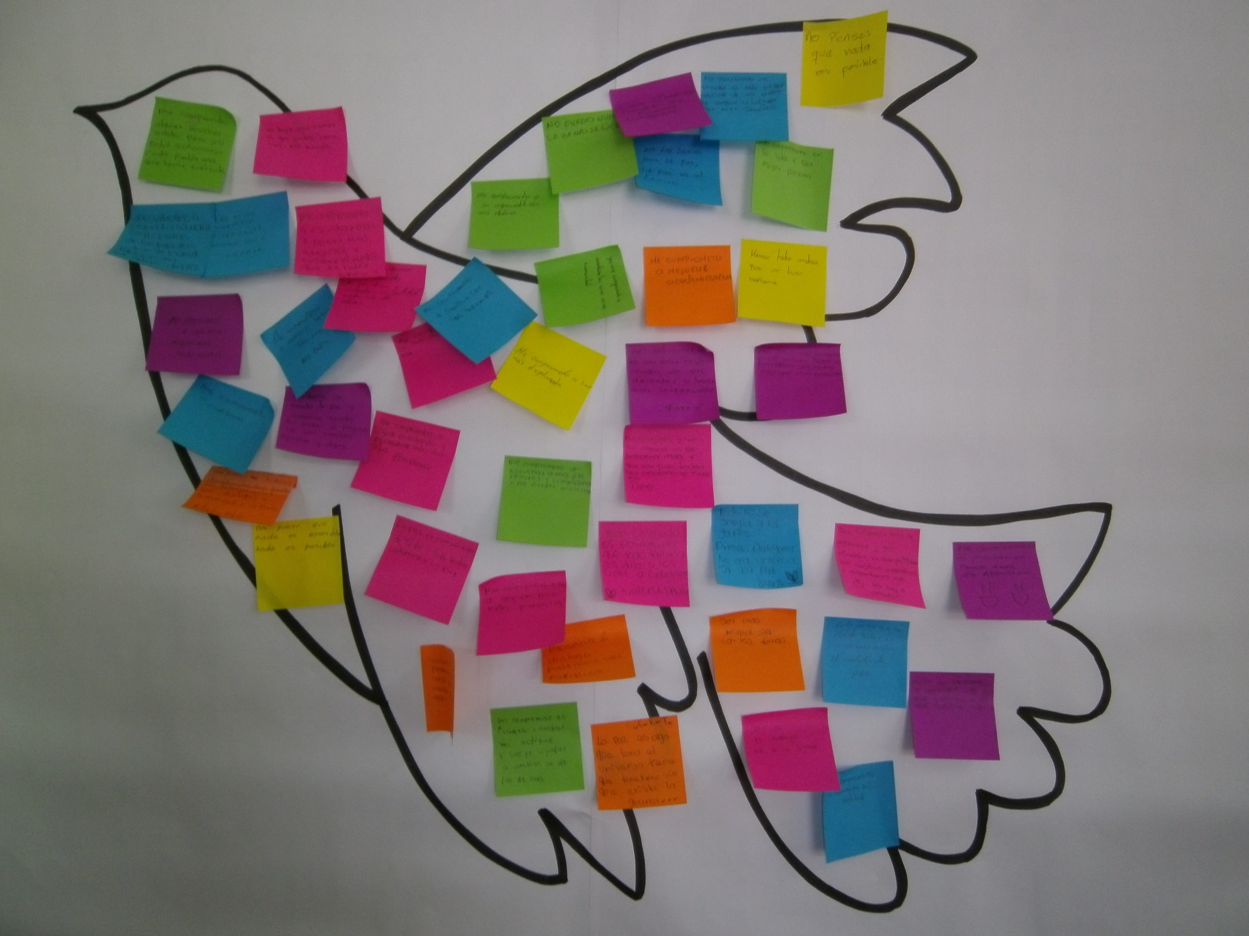 Durante la entrega de los certificados se realizó un acto simbólico en donde los nuevos facilitadores de paz escribieron sus compromisos y reflexiones para contribuir a la paz y los pegaron en el dibujo de una paloma de la paz.