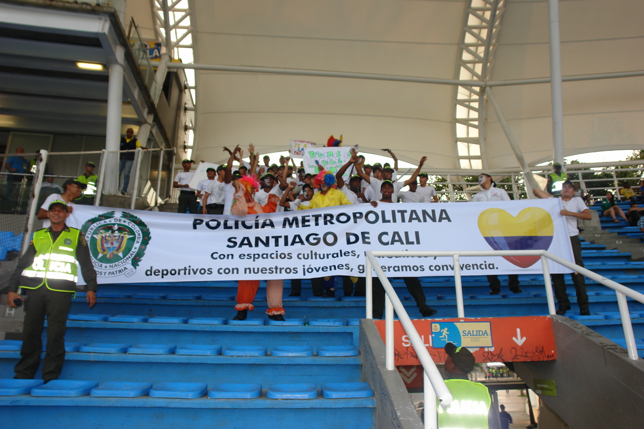 Disfrazados de mimos, 60 auxiliares de la Policía Metropolitana de Cali iniciaron la campaña de convivencia y seguridad ‘La barra de la paz’, en el Estadio Pascual Guerrero.