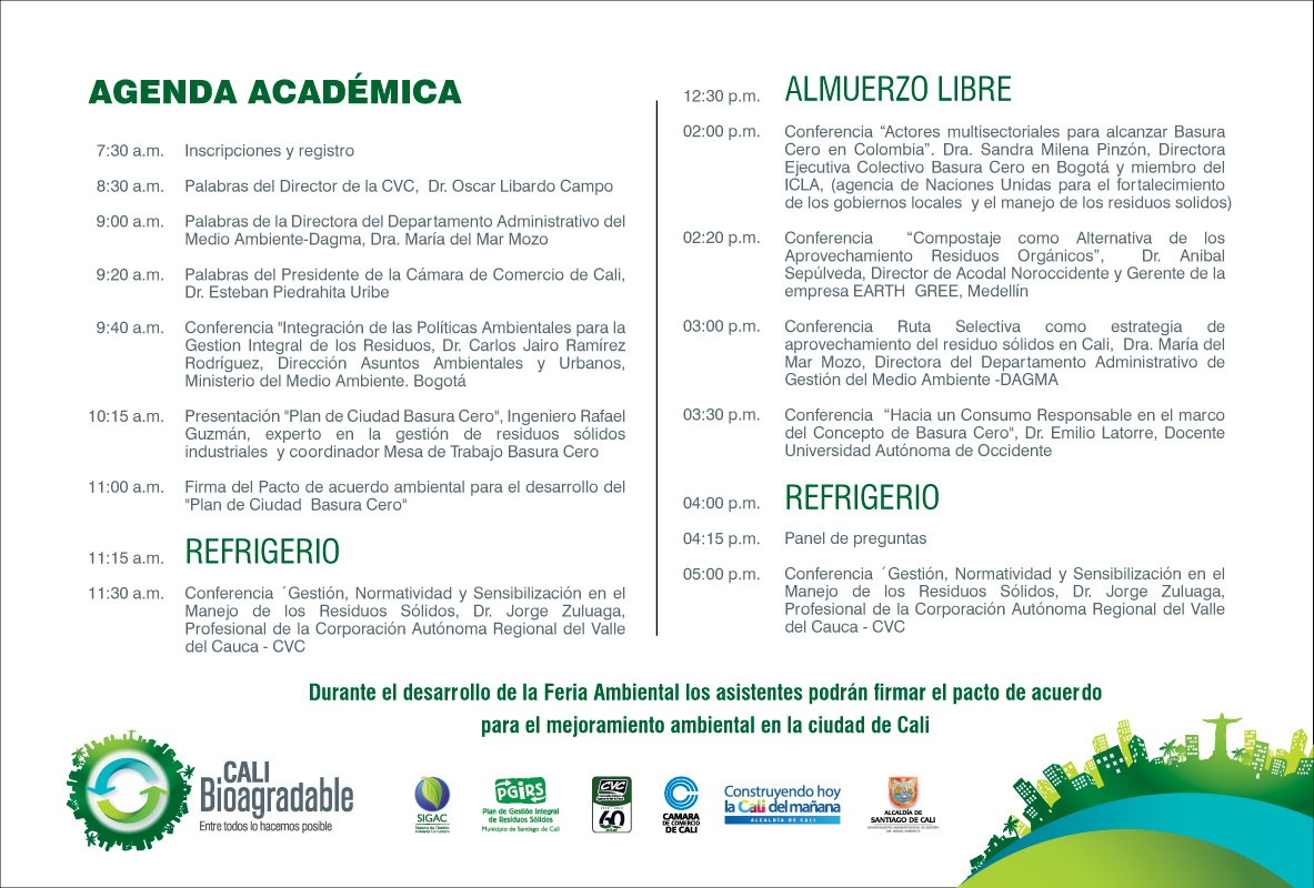 Algunos de los temas que se presentarán durante la Feria, que tiene el lema Cali Bioagradable, son: ‘Integración de las políticas ambientales para la gestión integral de los residuos’, por parte del Minambiente, y la ‘Ruta Selectiva, estrategia de aprovechamiento del residuo sólido en Cali’, a cargo de la directora del Dagma, María del Mar Mozo Muriel.