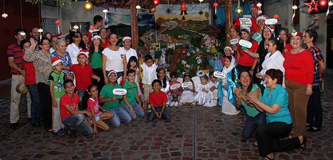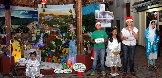 La comisión de la Alcaldía fue recibida con villancicos por más de 80 personas, de todas las generaciones, vestidas de camisetas rojas o verdes, con gorros de navidad, con niños vestidos de ángeles, la virgen María humana, la presentación a capela de un villancico por parte de una niña y la reflexión de cada día de la novena representada por adultos y niños para afianzar la unidad que se generó con la realización del pesebre.