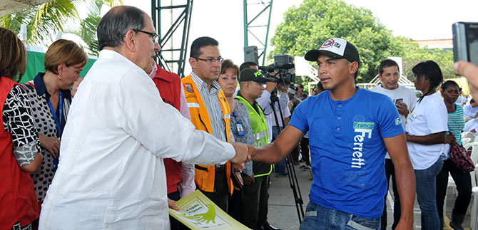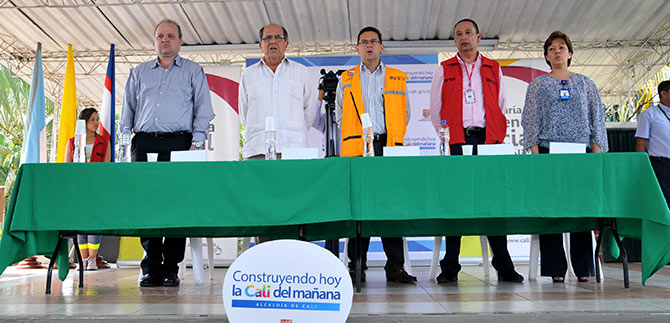 El alcalde de Cali Rodrigo Guerrero, en compañía del superintendente de Notariado y Registro, Jorge Enrique Vélez, y el secretario de Vivienda, Juan Carlos Rueda, entregan las escrituras a 342 familias beneficiarias del proyecto de vivienda de interés prioritaria Potrero  Grande, etapa 5, lote11.
