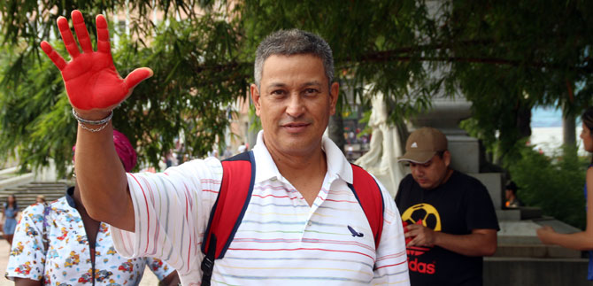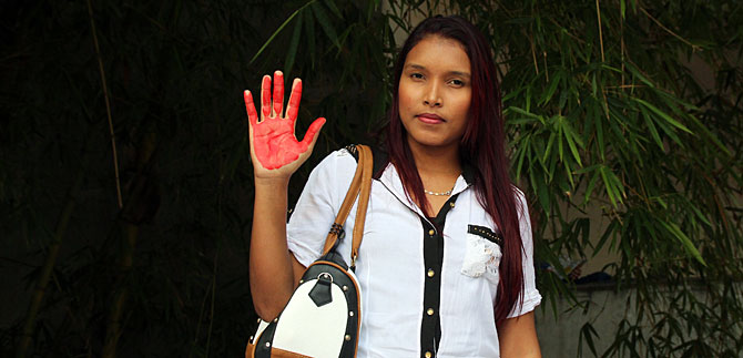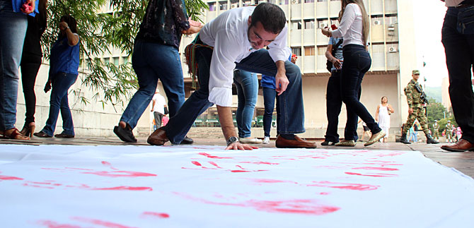 Los transeúntes de la plazoleta del CAM y niños de los colegios de Petecuy pintaron este jueves 12 de febrero sus manos de color rojo, como símbolo de protesta contra el reclutamiento infantil.