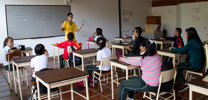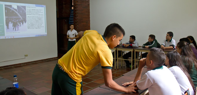Al asistir a una de las clases desarrolladas por maestrillos –estudiantes con rol de profesor– y coordinadas por profesores de idiomas, el alcalde Rodrigo Guerrero Velasco verificó el avance del programa de bilingüismo Go Cali – English Together, en el colegio Berchmans.