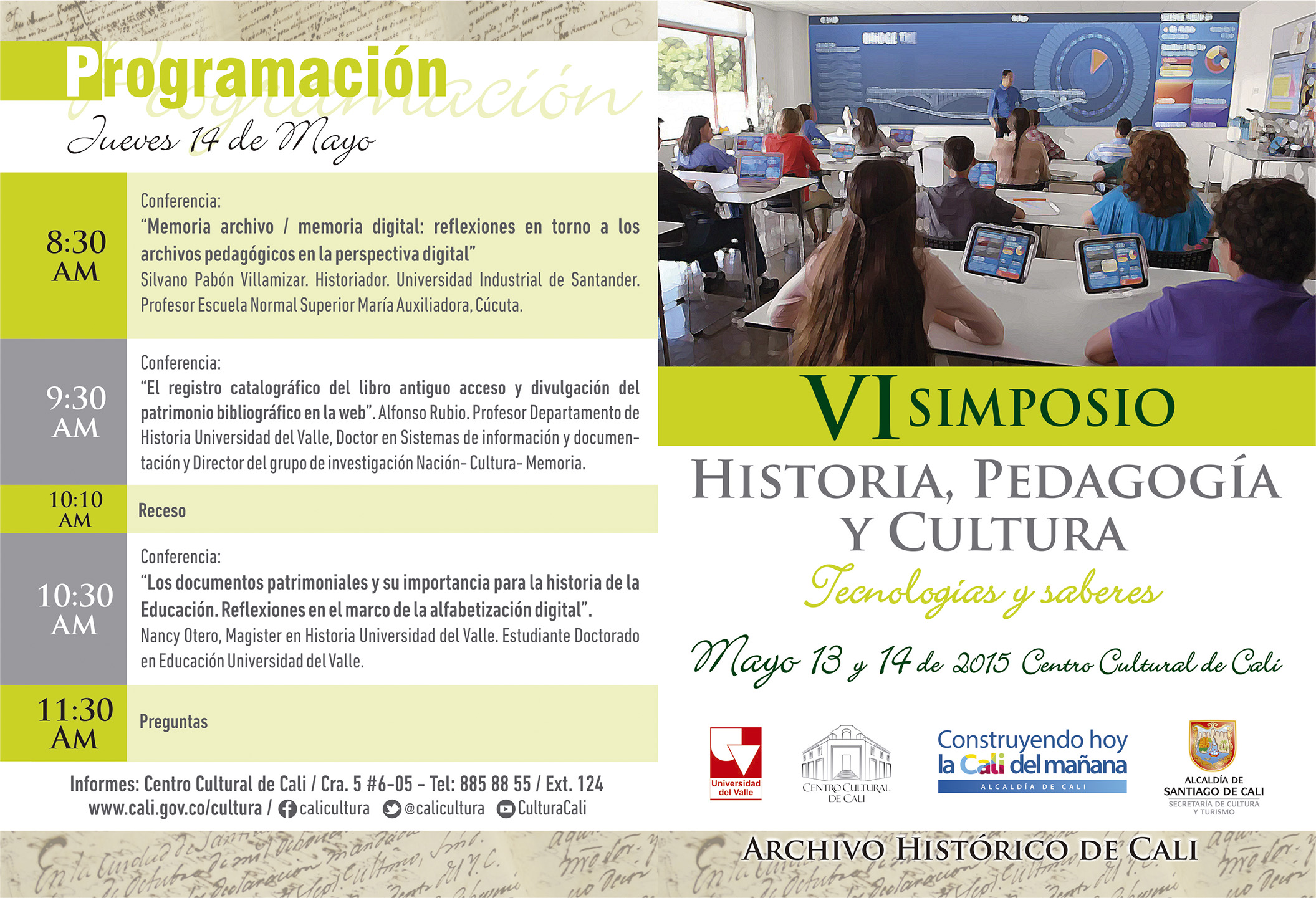 La Secretaría de Cultura y Turismo desde el Archivo Histórico de Cali, de la mano del Grupo de Historia de la Práctica Pedagógica invita a la ciudadanía y en especial a los maestros en su mes, al VI Simposio Historia Pedagogía y Cultura, dedicado en esta ocasión al tema de Tecnologías y Saberes.