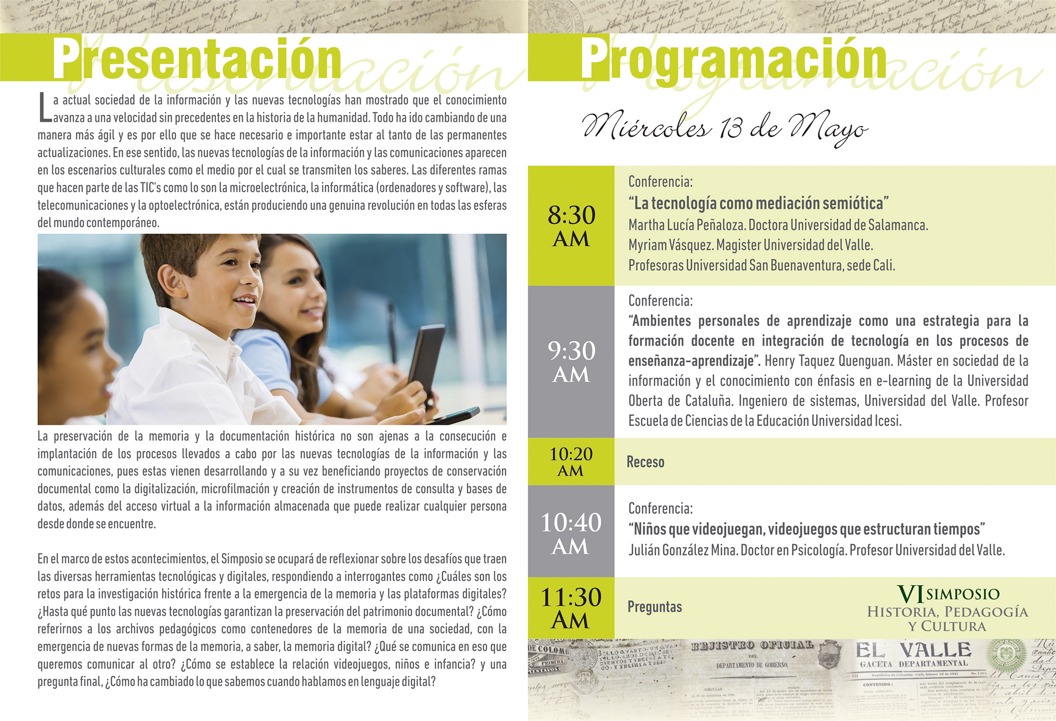 El VI Simposio Historia, Pedagogía y Cultura se llevara a cabo los días 13 y 14 de mayo en Auditorio Principal del Centro Cultura de Cali, en la jornada de la mañana.