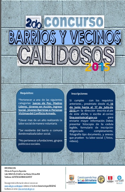 Usted se puede postular a los concursos  ‘Barrios  y Vecinos Calidosos’ e ‘Iniciativas Comunitarias’, liderados por la Asesoría de Paz, si usted es de esas personas que lleva más de un año ejerciendo labor social en su barrio o hace parte de organizaciones,  que sin ánimo de lucro se encargan de promover el arte y la cultura en su  barrio para fomentar la paz,  anhela que su iniciativa sea reconocida y premiada para impactar a otras personas,