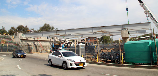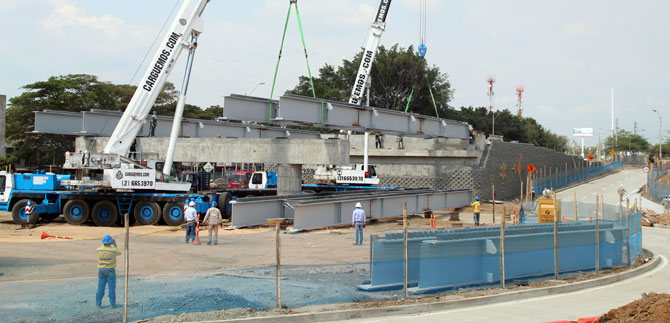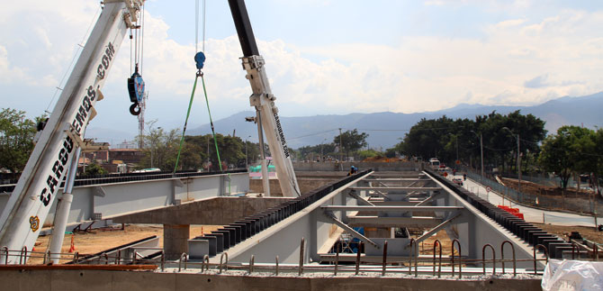Tres juegos de vigas metálicas inician el izado desde este lunes hasta dentro de cerca de tres semanas, para armar el puente a desnivel que se construye en la intersección de la Avenida ciudad de Cali con carrera 1ª en la salida a Palmira, que se espera entre en funcionamiento el próximo 7 de diciembre.