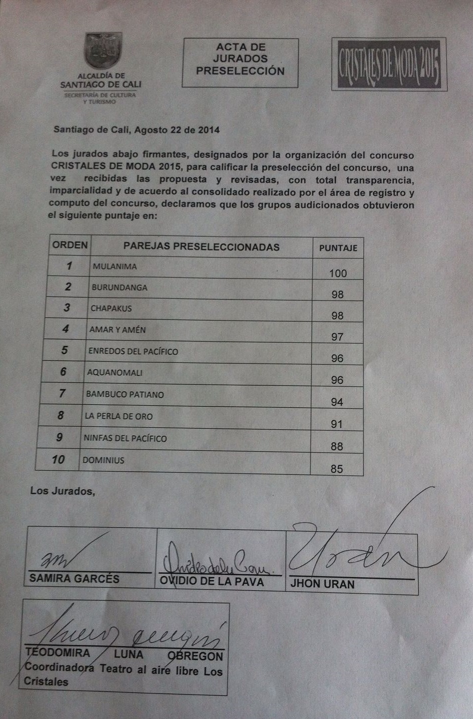 El 18 de agosto  se cerraron las inscripciones al concurso con 15 propuestas presentadas, tras una ardua jornada el jurado calificador conformado por los diseñadores de moda: Ovidio de la Pava, John Uráan y Samira Garcés determinó que las propuestas que alcanzaron los  10 mayores puntajes fueron: