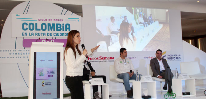 Durante el foro, la viceministra de MinTic, María Carolina Hoyos, dirigió el panel ‘Las regiones colombianas y sus avances en la construcción de ciudades inteligentes’, en el que participó Roberto Reyes, asesor de Informática y Telemática de la Alcaldía de Cali; Fernando Murgueítio, alcalde del municipio de Yumbo; Rubén Darío Salazar, alcalde de Buenavista, Quindío; Walter Zúñiga, alcalde de Miranda –Cauca-; Wiesner Osorio, ganador del concurso ‘Una idea para cambiar la historia’ de History Channel y Bobby Gordon, fundador de Ciudadanos Activos.
