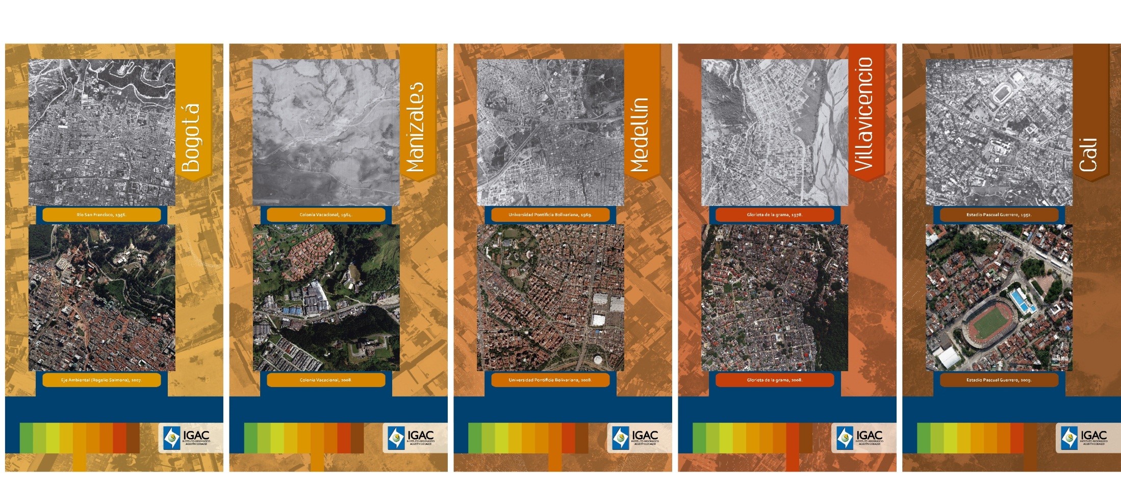 La muestra cuenta con 10 pendones autoportantes compuestos por texto introductorio y 9 ciudades capitales captadas en dos aerografías (pancromática y digital) para que el público pueda apreciar los cambios que han tenido las ciudades en los últimos 70 años.