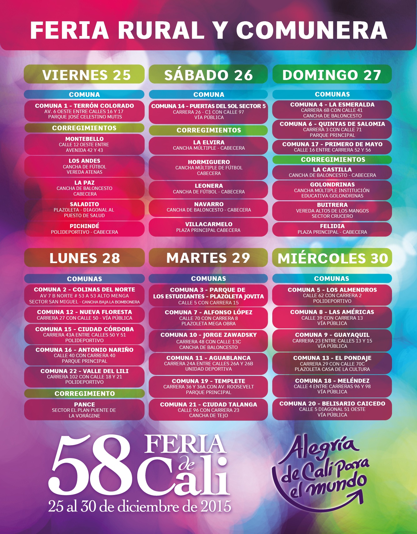 Este año la programación de la feria rural y comunera es bastante variada y en diferentes localidades de nuestra ciudad, lo cual permitirá a propios y visitantes, disfrutar desde el 25 al 30 de diciembre de todo el sabor y la alegría que caracteriza a los caleños, con la siguiente programación.