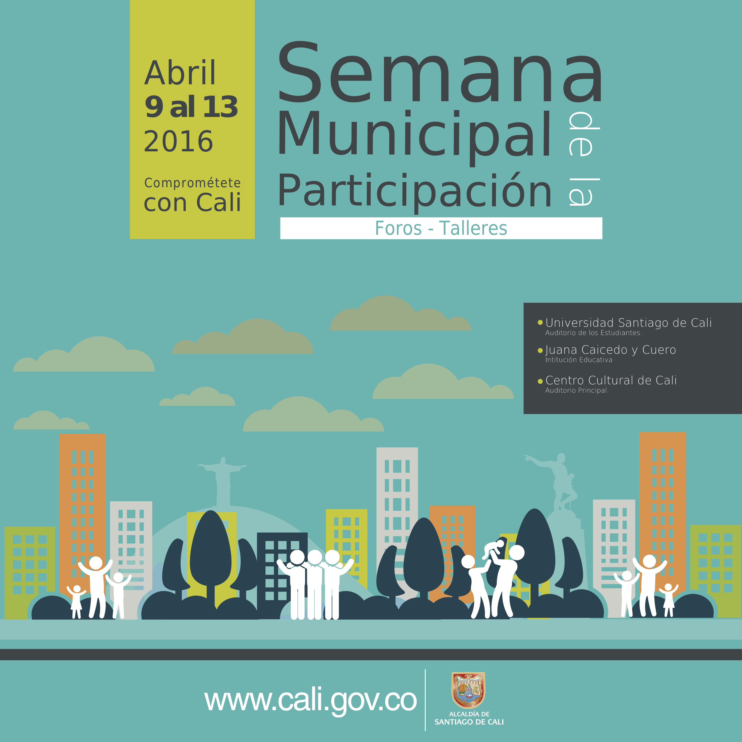 Con miras a fortalecer los procesos de liderazgo, incentivar la participación de actores sociales e integrar a la ciudadanía con el quehacer público se realiza desde el sábado 9 de Abril la semana Municipal de la Participación: Comprométete con Cali.