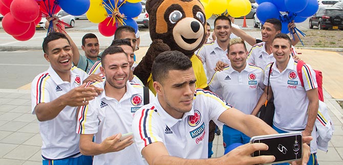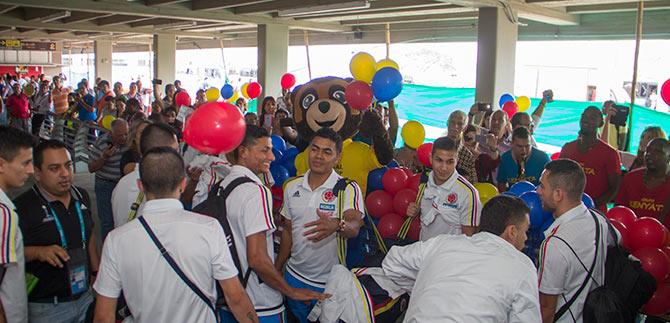 Antes del arribo al autobús que los llevara al Hotel Intercontinental, donde se hospedarán durante el torneo, los 14 integrantes del equipo colombiano elevaron la mascota del mundial por los aires, en un acto de alegría, tranquilidad y agradecimiento por el afectuoso recibimiento.