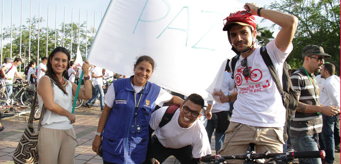 Cientos de estudiantes universitarios de Cali pedalearon por la paz. La convocatoria, iniciativa de los jóvenes, tenía como objetivo promover el uso de la bicicleta y respaldar el proceso de paz.