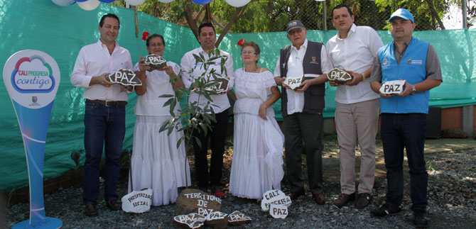 Las mujeres del grupo Arte Vivir del Adulto Mayor, sembraron 40 piedras con la palabra “paz” al lado de un Guayacán que fue plantado en el lugar, el cual identificará este sitio de la comuna 13 como territorio de Progreso y Paz.