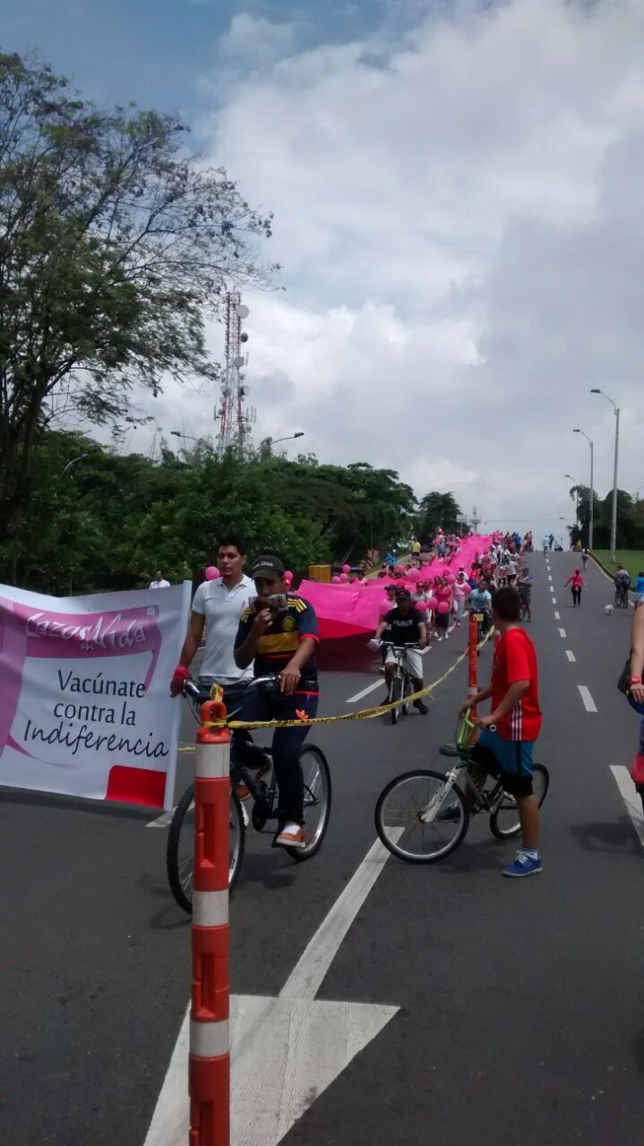 Hoy se vio todo ese color desde la calle 50 con carrera16, tramo en el que además se realizó una marcha de centenares de personas organizada por Funcáncer, la cual formó el gran lazo rosado en el Parque El Ingenio en apoyo a aquellos pacientes que han tenido y padecen cáncer de mama, todo ello bajo el eslogan de “vacúnate contra la indiferencia”.