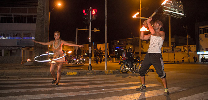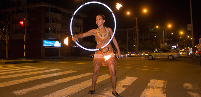 Cindy Jaramillo, a sus 27 años, ha recorrido las calles de la ciudad transmitiendo el amor al arte, al circo, a los malabares, de día y de noche, para arrancar una sonrisa a cada persona que la ve en escena, una tal vez muy arriesgada y con su inseparable amigo: el hula hula.