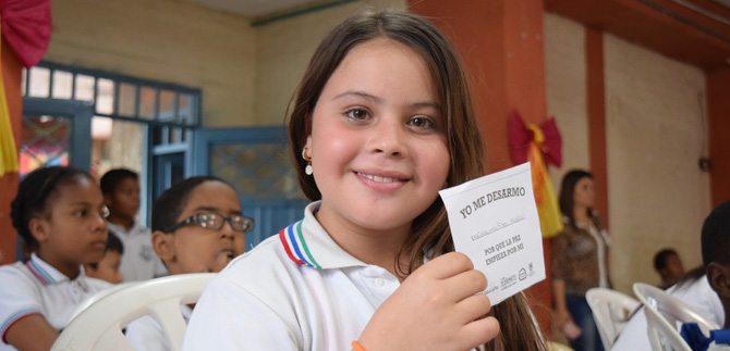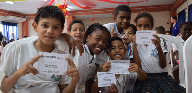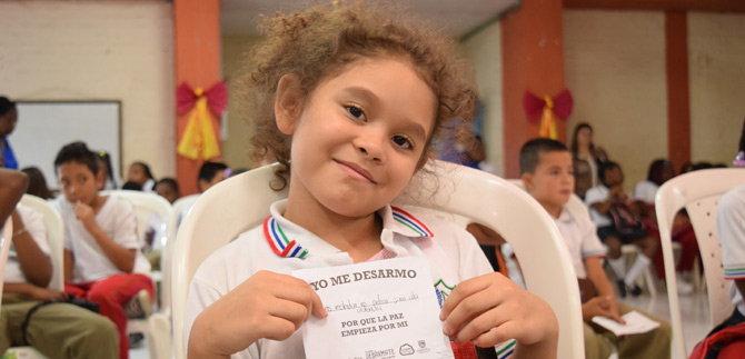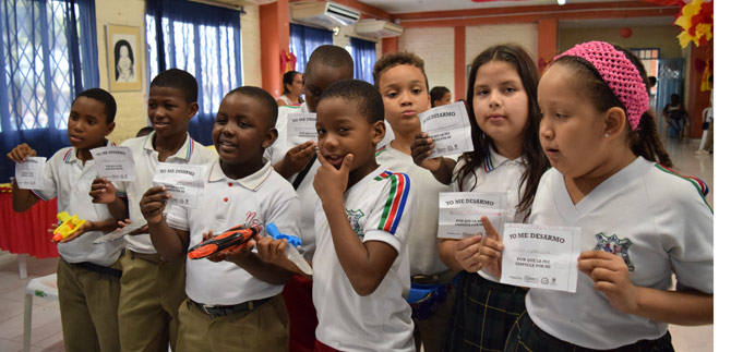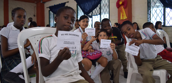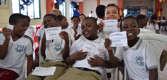 Por ejemplo, Alejandro Caicedo, del Grado Quinto, se desarmó de la desobediencia. “Para mí la paz es algo que los niños debemos aportar en la vida cotidiana, y se logra con esfuerzo y dedicación, nos lo enseñan en la casa y en los colegios. Nos ayuda a ser una persona mejor en el futuro. Hoy me desarmé de la desobediencia”.