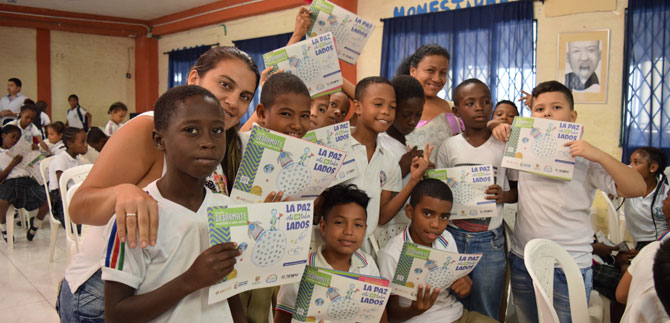 El auditorio: 300 estudiantes de primaria de la Institución Educativa Tecnológica Desepaz, ubicada en la Comuna 21 de Cali. Todos ellos recibieron el ejemplar a cambio de comprometerse con ser multiplicadores de paz y de desarmarse de acciones o pensamientos que no aporten a ello.
