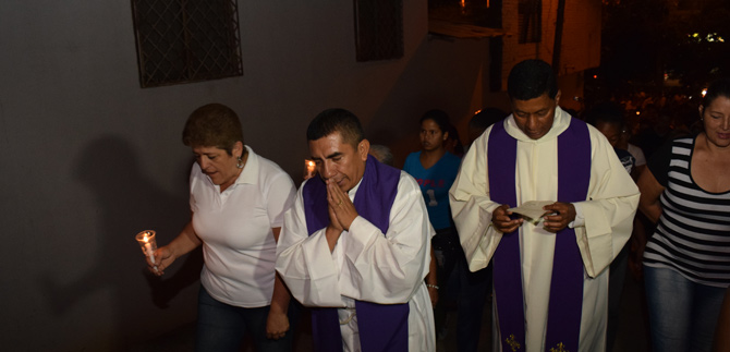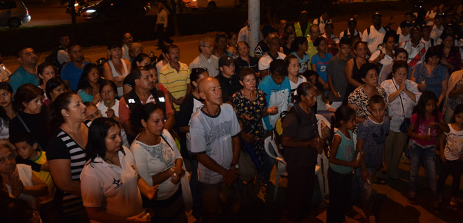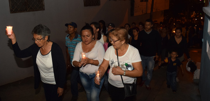 Vecinos, amigos de las víctimas y funcionarios de la Administración Municipal se acompañaron en una peregrinación desde el lugar de los hechos y con velas y entre oraciones caminaron hasta el punto del acto litúrgico, en dónde despidieron simbólicamente a estas personas.