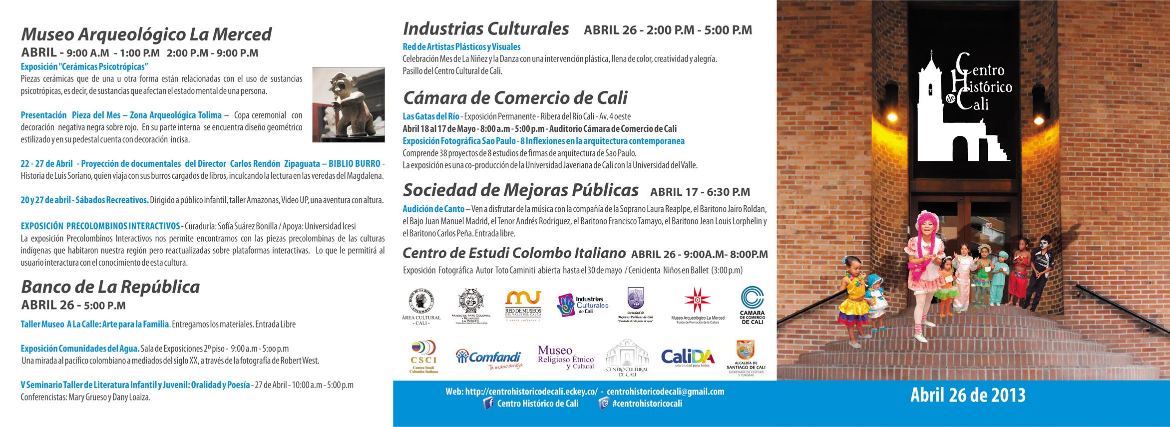 De 2:00 a 5:00 p.m., el proyecto Industrias Culturales realizará la intervención plástica, en el pasillo del Centro Cultural de Cali y el Banco de la República. A partir de las 5:00 p.m., se hará el Taller Museo a la Calle. A su vez, se ofrece la exposición ‘Comunidades de agua’, y el ‘V Seminario de literatura infantil y juvenil: oralidad y poesía’.