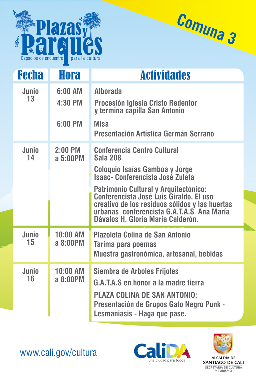 Con el ánimo de rendir homenaje a las tradiciones religiosas, culturales y artísticas de Cali, la Secretaría de Cultura y Turismo se suma a la organización de las Festividades Patronímicas de San Antonio que se iniciarán este jueves 14 de junio, con la tradicional alborada.