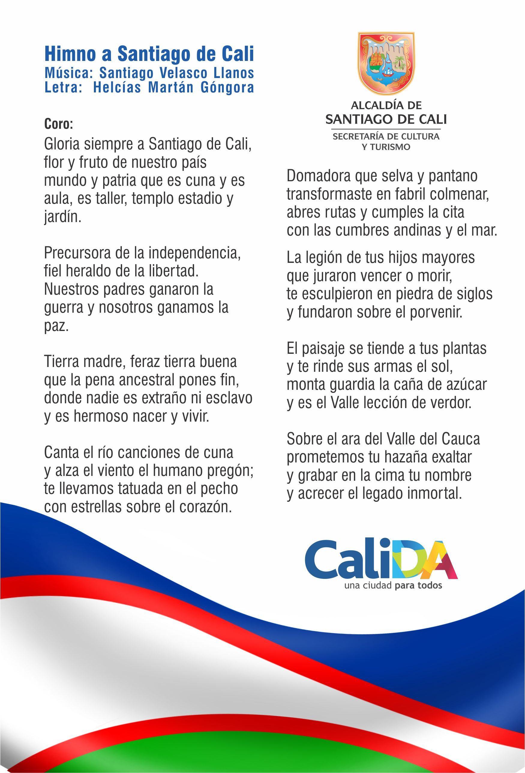 “Los caleños debemos conocer que nuestra hermosa bandera fue creada por Nicolás Ramos Hidalgo, siendo alcalde de la ciudad en 1928 y adoptada oficialmente mediante el Decreto 295 del 31 de mayo de 1954. Así mismo, debemos entonar el Himno a Santiago de Cali, cuya letra es original del poeta Helcías Martán Góngora y música compuesta por el maestro Santiago Velasco Llanos”, señaló la funcionaria.