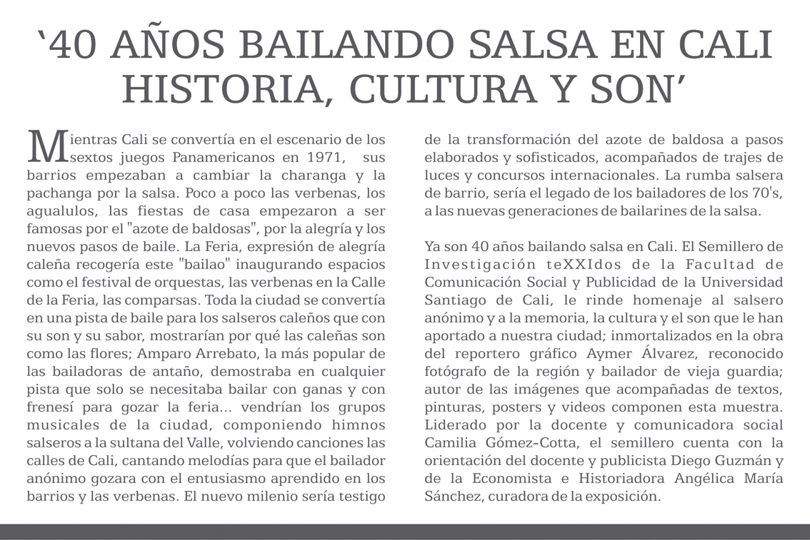 ‘40 años bailando salsa en Cali, historia, cultura y son’, es el producto de la exhaustiva investigación del semillero Texxidos, de la Facultad de Comunicación Social y Publicitaria, de la Universidad Santiago de Cali, con la cual se le rinde homenaje al salsero anónimo y a la memoria, así como a la cultura y al son que le han aportado a la ciudad; son aspectos inmortalizados en la obra del reportero gráfico Aymer Álvarez, reconocido fotógrafo de la región y bailador de vieja guardia, y autor de la imágenes que acompañadas por textos, pinturas poster y videos, componen esta muestra.