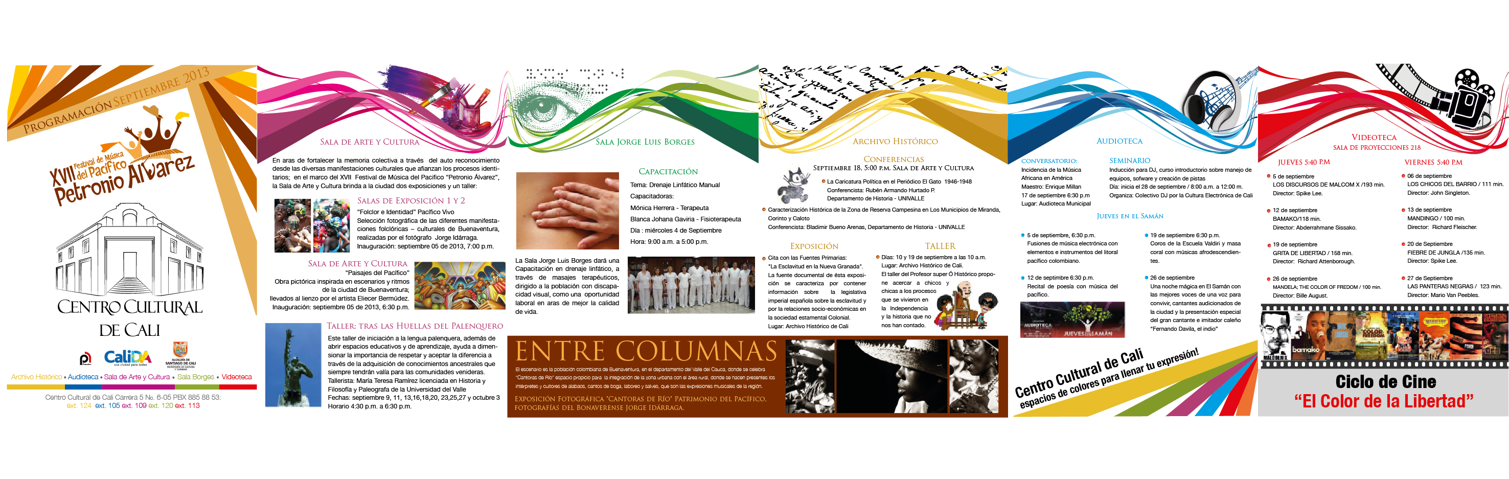 Septiembre será el mes de la cultura Afro en Cali, gracias a la realización de la III Cumbre Mundial de Alcaldes y Mandatarios Afrodescendientes y del XVII Festival de Música del Pacífico Petronio Álvarez, eventos que contagian las manifestaciones de las poblaciones afro, algunas asentadas y otras que visitan nuestra ciudad. Motivo inspirador de la diversa y completa programación septembrina en el Centro Cultural de Cali.