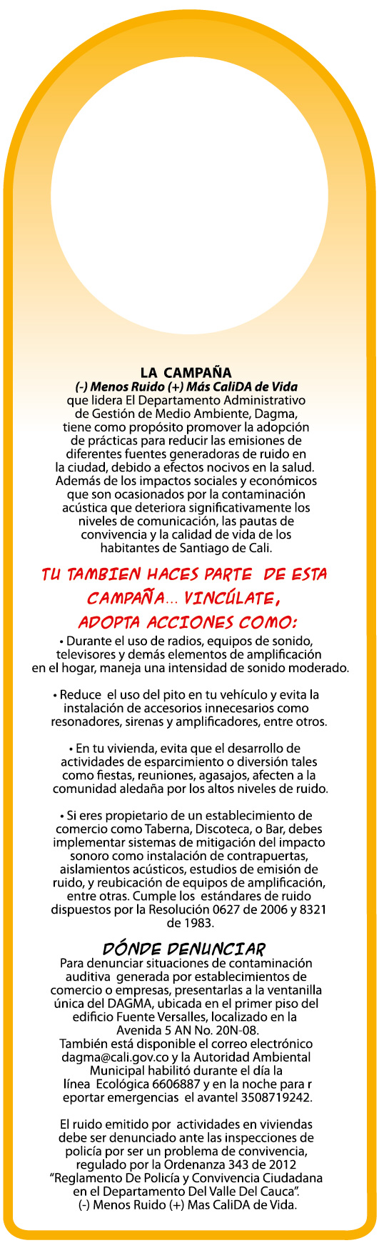 La Funcionaria agrega que “para el día viernes, el Dagma presentará la campaña (-)Ruido (+) CaliDa de Vida, a través de una exposición, se contará cómo son las mediciones durante los operativos de control de ruido y se repartirán colgapuertas con material informativo. Recordemos que gran parte de esa dinámica se ha desarrollado durante las intervenciones en la plazoleta del CAM y en las instalaciones de la Autoridad Ambiental, para dar a conocer la estrategia educativa en mención”.