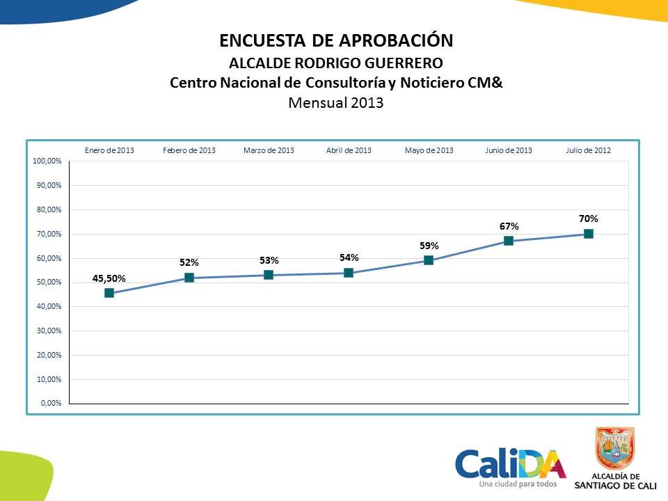 Durante el mes de Julio y tal como ha sido la constante en este 2013, el nivel de favorabilidad sigue creciendo entre los caleños, que lo posicionan como uno de los mejores ocho mandatarios locales del país, con un 70% de imagen positiva, según la encuesta del Centro Nacional de Consultoría y el Noticiero CM&.