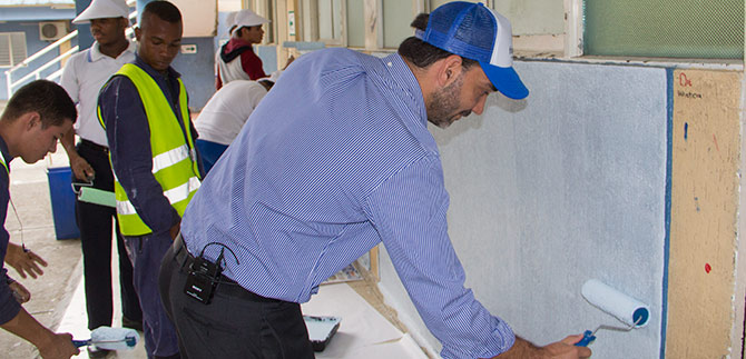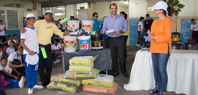 Pintura, cemento, brochas, rodillos y otros implementos para la pintura de la fachada, fue la donación de Finprogreso la empresa que de la mano de la Secretaría de Educación, facilito el desarrollo de este primer acto voluntario y altruista por el mejoramiento de la calidad de ambientes escolares de los niños, niñas y jóvenes de este sector de la ciudad.