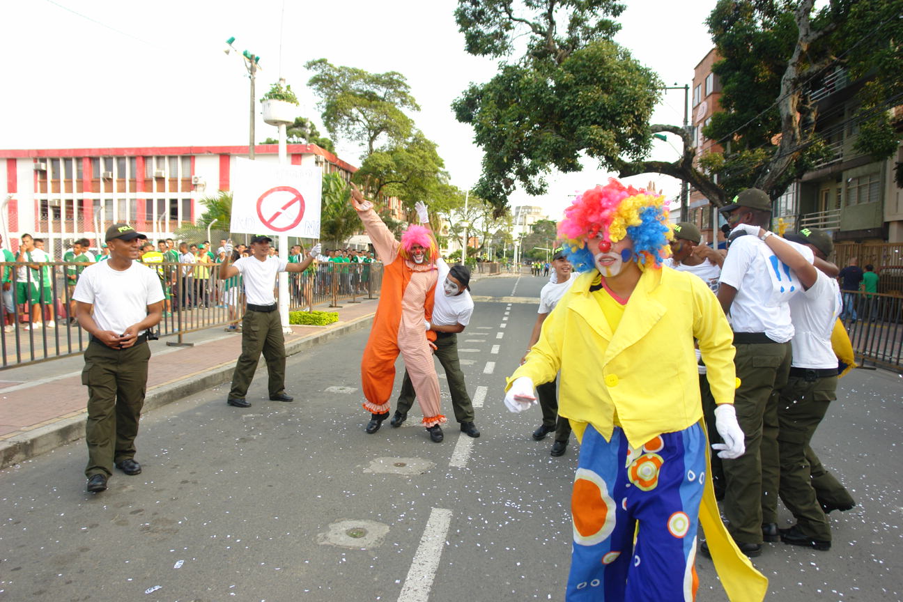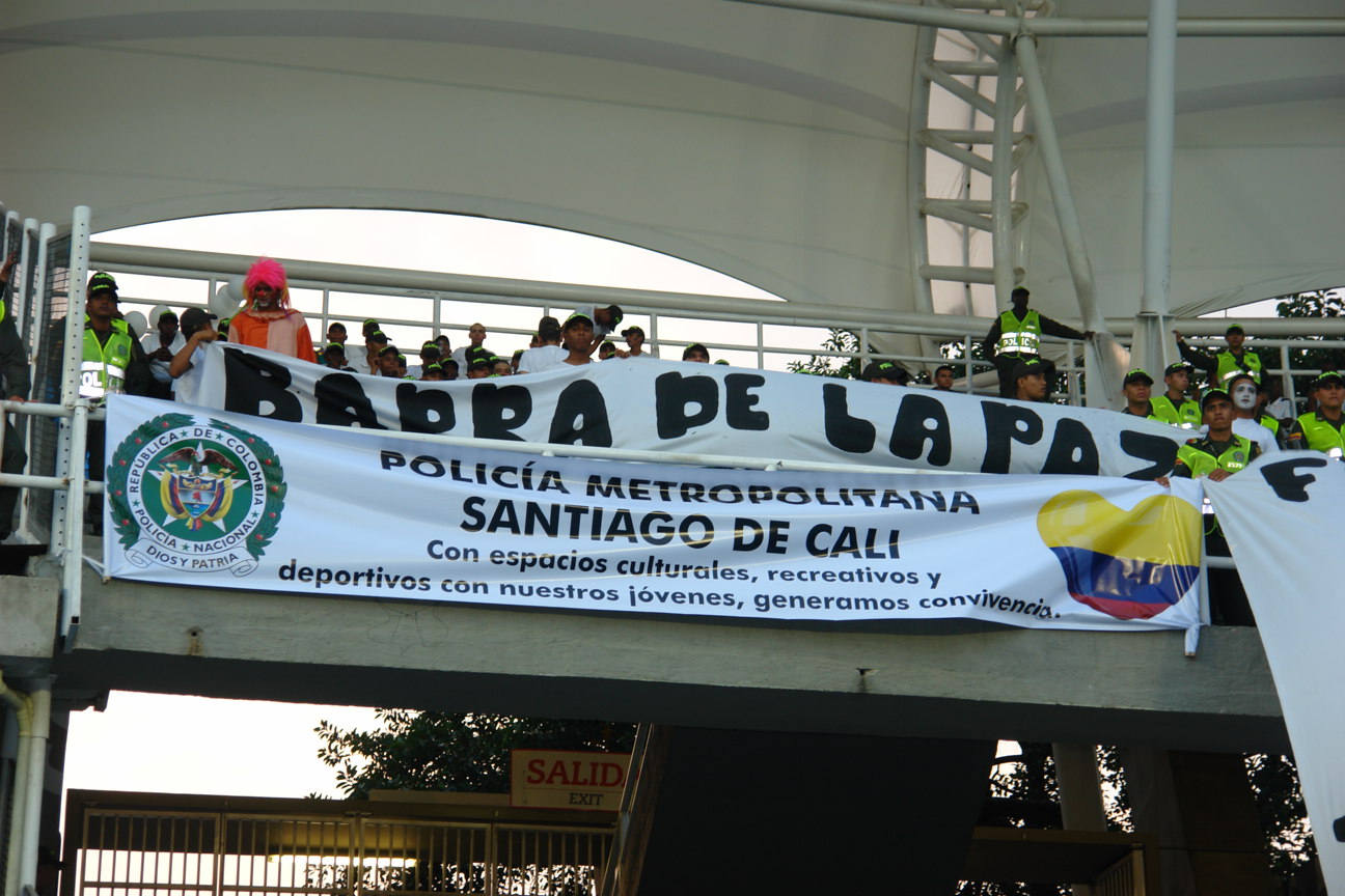 Disfrazados de mimos, 60 auxiliares de la Policía Metropolitana de Cali iniciaron la campaña de convivencia y seguridad ‘La barra de la paz’, en el Estadio Pascual Guerrero.