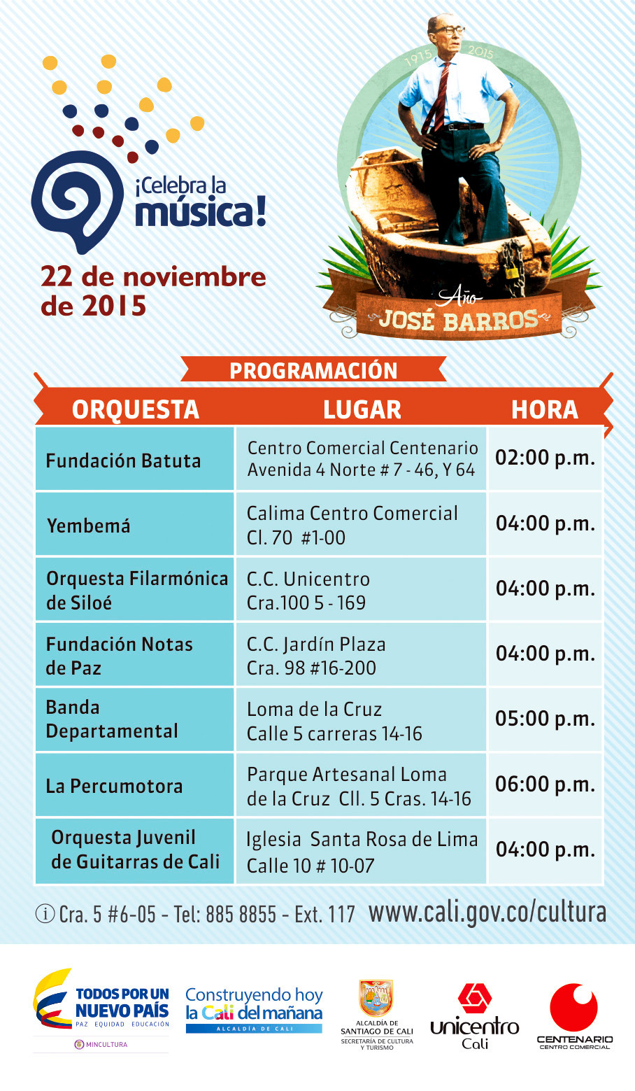 ‘Celebra la Música’ estará en diez (10) lugares de la ciudad este domingo 22 de noviembre, con la programación que reúne variados ritmos musicales autóctonos colombianos, interpretados por El Coro y Orquesta Infantil Decepaz, Yembemá, Coro Valdiri, Batuta, Coro Audioteca SCTC, Orquesta Infantil y Juvenil Siloé, orquesta Infantil y Juvenil Notas de Paz, Orquesta Juvenil Guitarras de Cali, Banda Departamental de Bellas Artes y la Percumotora.