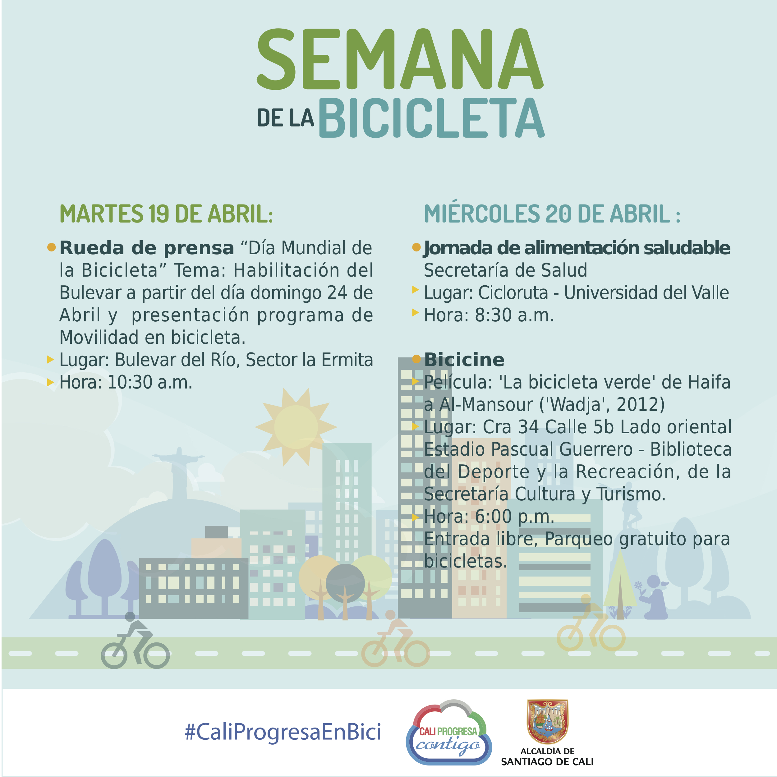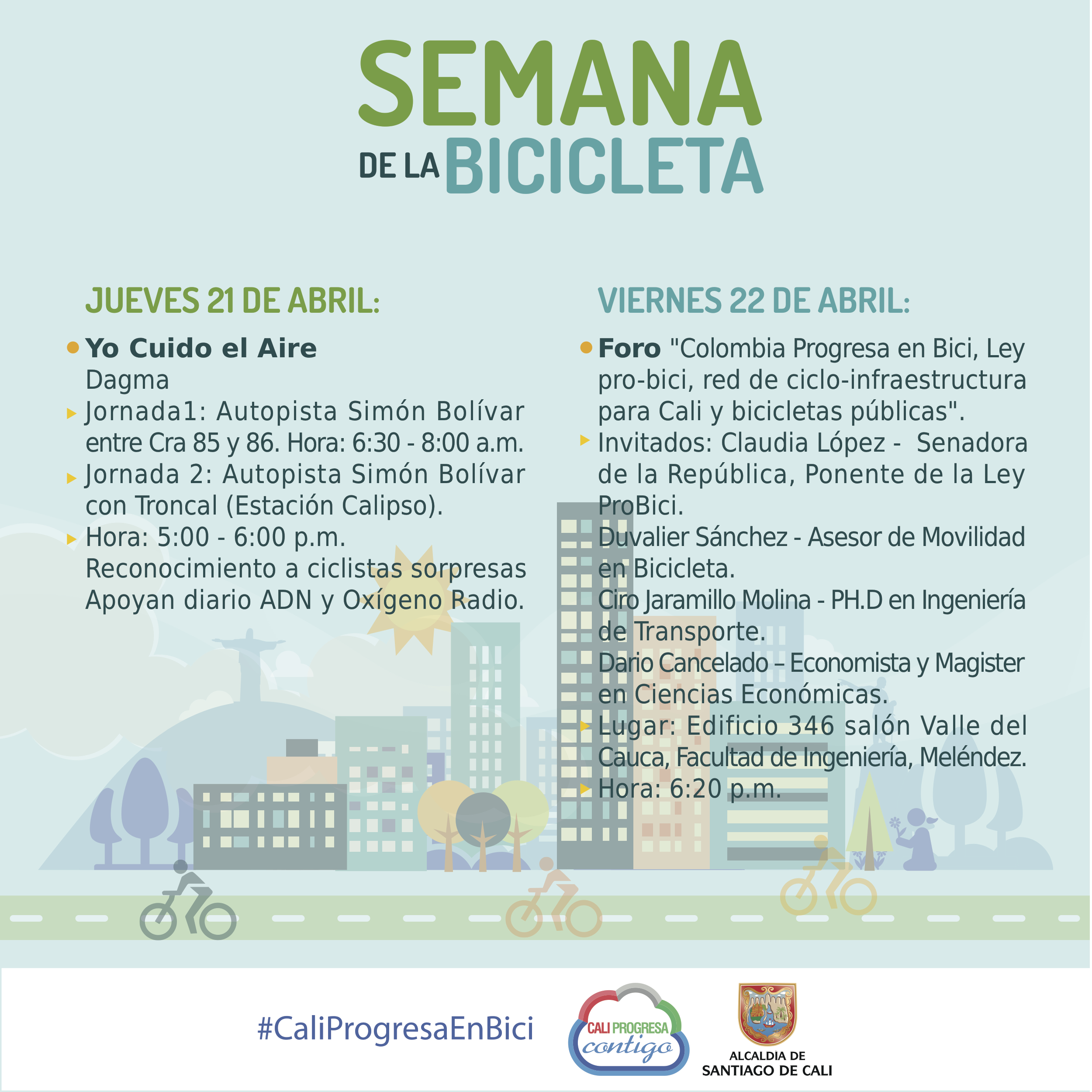 Con una agenda cultural, deportiva, ecológica y académica, Cali celebra su semana de la Bici, que se extenderá hasta el próximo 24 de abril. Las diferentes dependencias de la Administración Municipal han programado actividades, en las que la ciudadanía está invitada a participar.